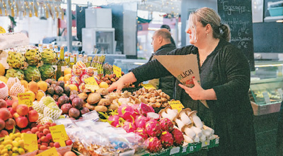 今年年初,受通胀压力和经济发展前景黯淡等因素影响,欧洲民众对消费普遍持谨慎态度。图为在德国法兰克福“小市场大厅”,一名摊主为顾客挑选水果。